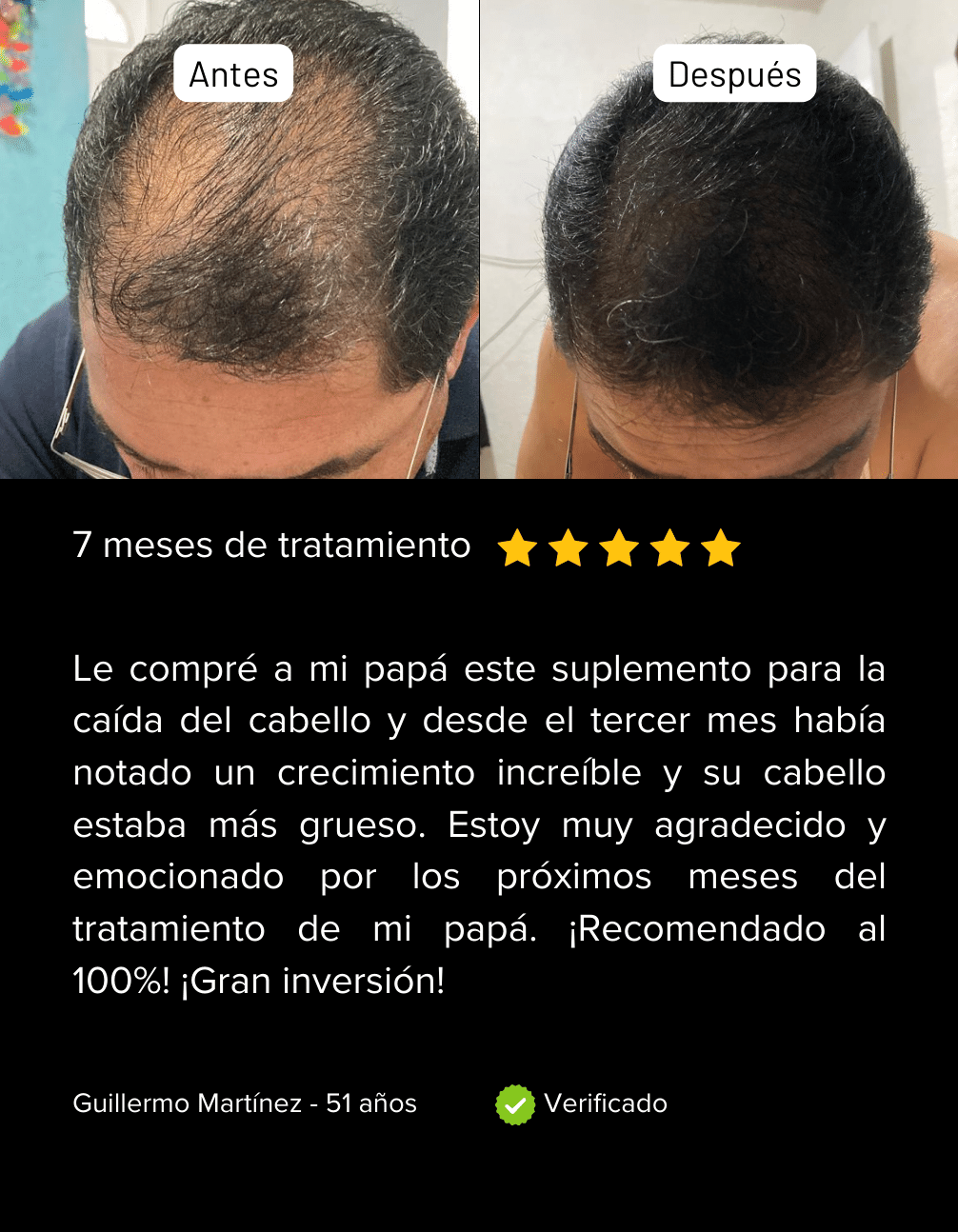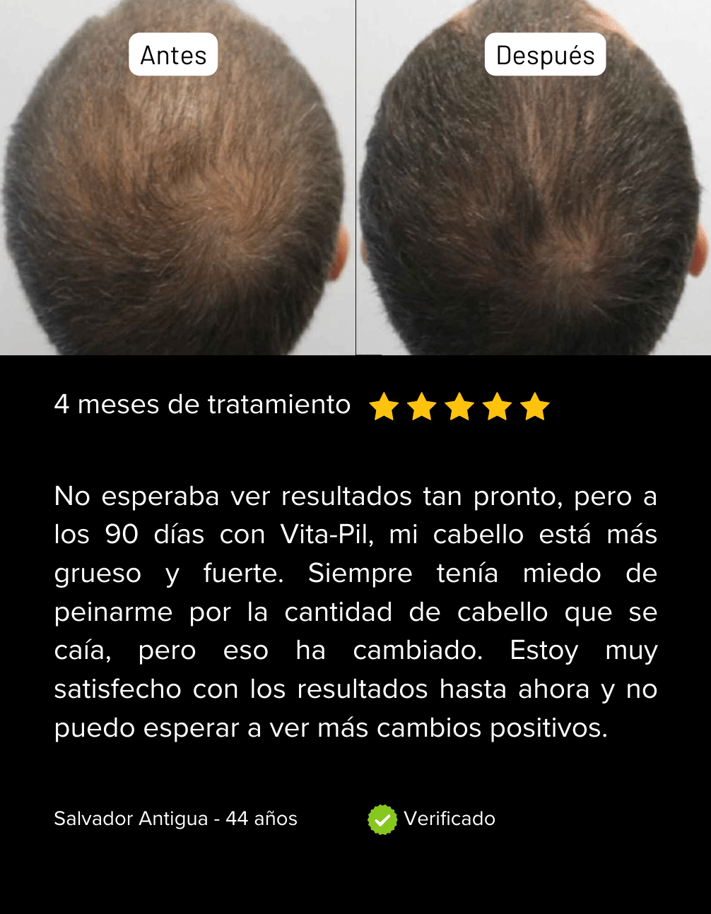 "Muchos de mis pacientes, tanto hombres como mujeres, han experimentado una mejoría notable en la salud de su cabello después de utilizar VitaPil. Al iniciar el tratamiento, presentaban áreas con poca densidad capilar y cabello débil. Tres meses después de seguir la suplementación diaria con VitaPil, he observado un fortalecimiento del cabello y un crecimiento más saludable, lo que ha aumentado su confianza."