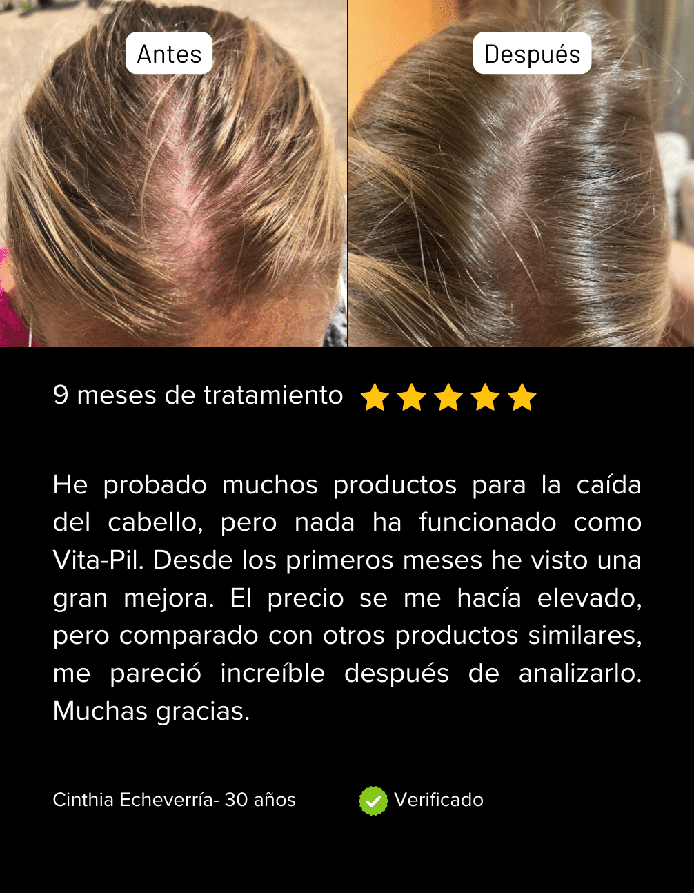 "Recomiendo VitaPil a mis pacientes que buscan una solución natural para la caída del cabello. Inicialmente, mis pacientes mostraban signos de pérdida capilar y cuero cabelludo expuesto. Después de 12 semanas utilizando VitaPil, noté una reducción significativa en la caída del cabello y un engrosamiento visible del mismo. Los resultados han sido consistentemente positivos, respaldando la efectividad del producto."