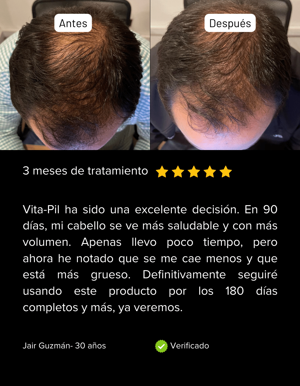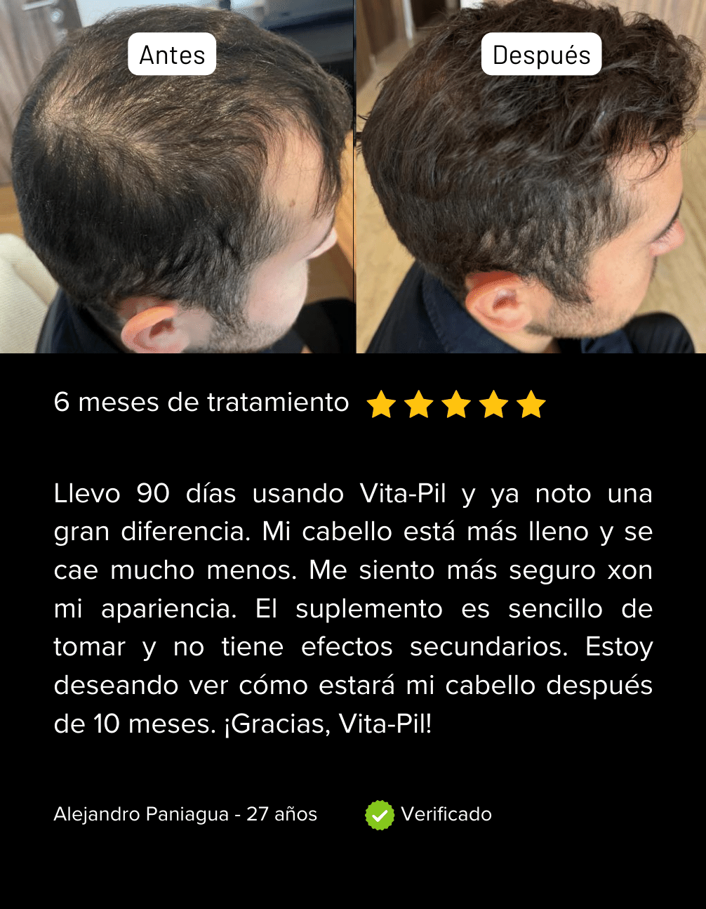 "Muchos de mis pacientes, tanto hombres como mujeres, han experimentado una mejoría notable en la salud de su cabello después de utilizar VitaPil. Al iniciar el tratamiento, presentaban áreas con poca densidad capilar y cabello débil. Tres meses después de seguir la suplementación diaria con VitaPil, he observado un fortalecimiento del cabello y un crecimiento más saludable, lo que ha aumentado su confianza."